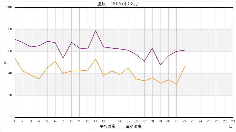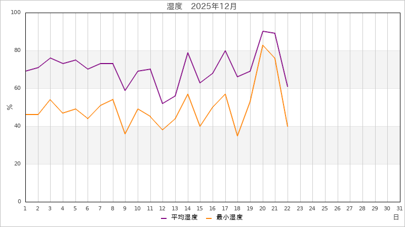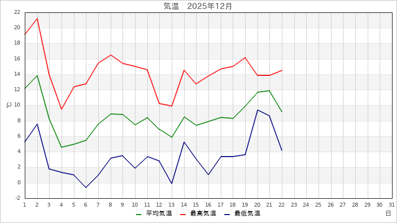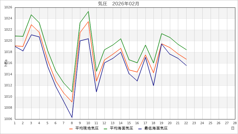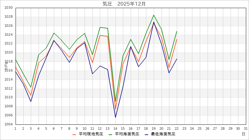 | 日 | 気温(℃) | 湿度(%) | 気圧(hPa) | |||||