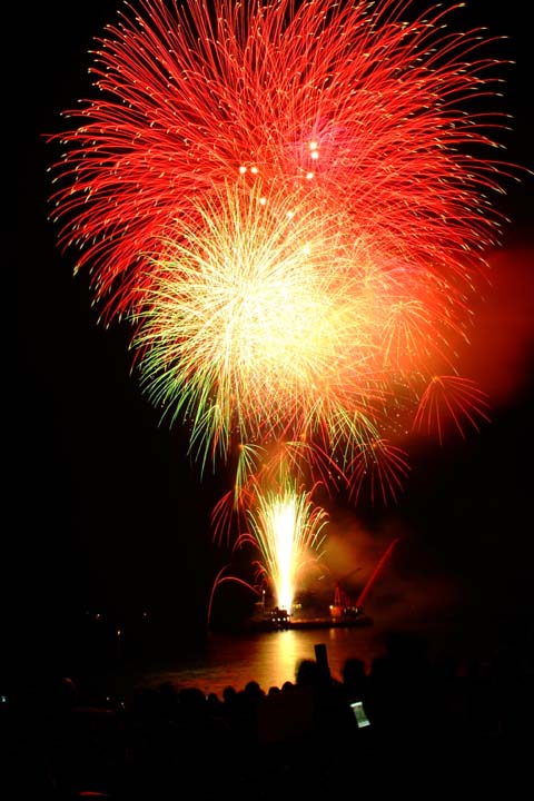 斜めに打ち上げて尺玉クラスの大玉を海面近くで開いたりするので迫力満点。