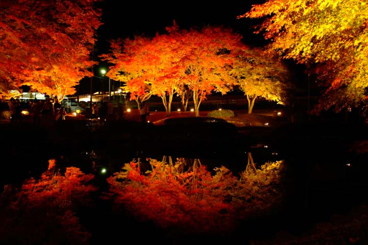 紅葉のシーズンになると園内の木々がライトアップされ、
