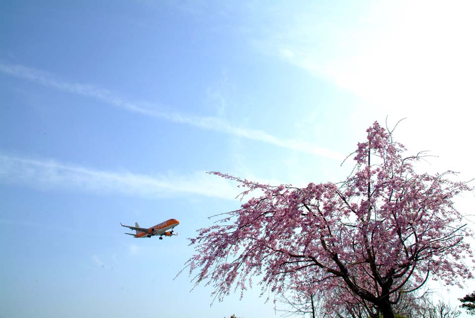 フジドリームエアライン(FDA)の飛行機とサクラの花のコラボを、